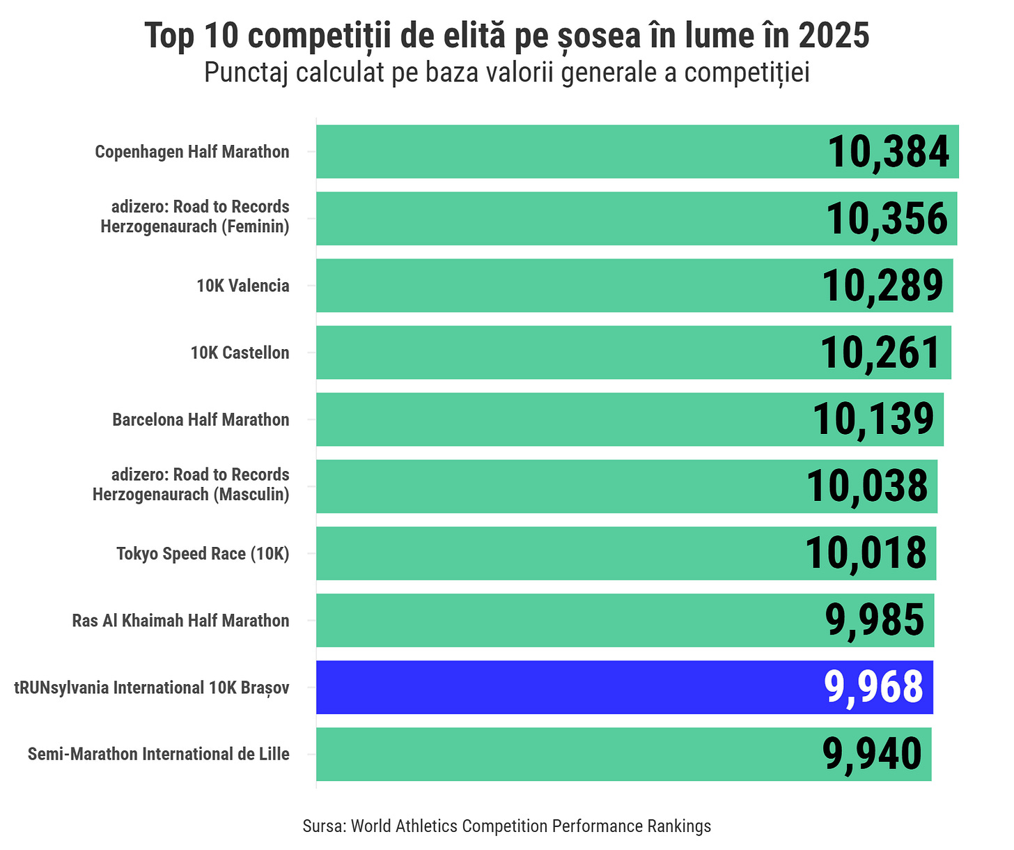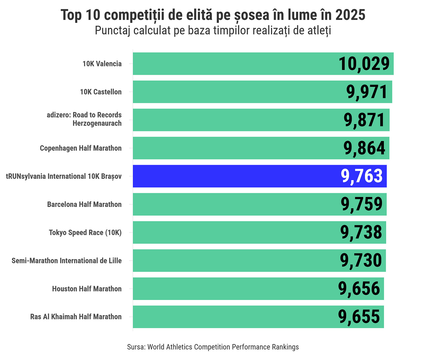 Bun. Acum că am lămurit exact locul Brașov Running Festival în lumea competițiilor globale de alergare, hai să revenim la performanța anunțată inițial: locul 5 în topul global al celor mai valoroase curse de elită pe șosea în 2025, pe baza clasamentului World Athletics Competition Performance Rankings. Mai exact, clasamentul numit oficial Result Score.